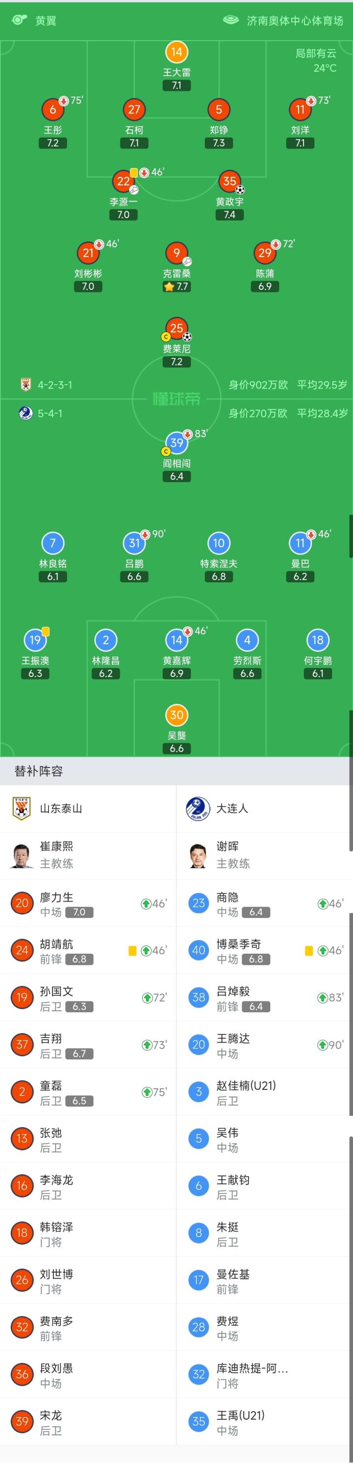 大连首发:30-吴龑、19-王振澳、2-林隆昌、14-黄嘉辉(46′40-博桑季奇)、4-劳烈斯、18-何宇鹏、7-林良铭、31-吕鹏(90+1′20-王腾达)、10-特索涅夫、11-曼巴(46′23-商隐)、39-阎相闯(83′38-吕焯毅)