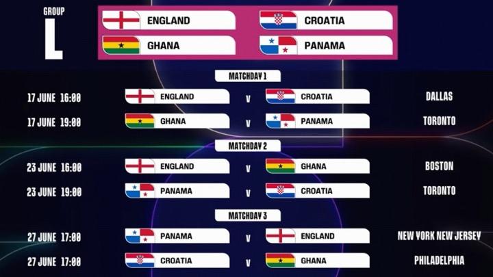L组:英格兰、克罗地亚、巴拿马、加纳