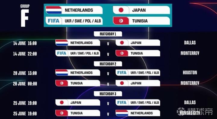 F组:荷兰、日本、突尼斯、欧洲附加B胜者