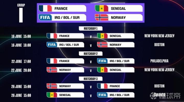 I组:法国、塞内加尔、挪威、洲际附加2胜者
